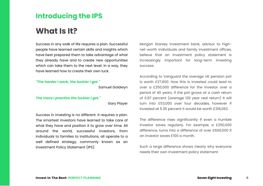 Seven Eight Investing offers Wall Street acumen to every doorstep, democratising access to financial expertise via affordable products.For institutions, high-net-worth individuals and family offices, developing an investment policy statement that reflects their goals and objectives is increasingly important for long-term investing success. Seven Eight Investing introduces the same tools to regular investors to help them plan intelligently for their future. Curated by a professional investor and CFA Charterholder. The guide makes proven strategies accessible to the regular investor.